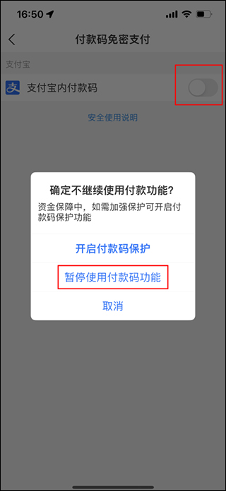 5、来到付款码免密支付页面,把“支付宝内付款码”选项右侧的开关按钮关闭,最后在弹出的页面当中选择“暂停使用付款码功能”选项即可。