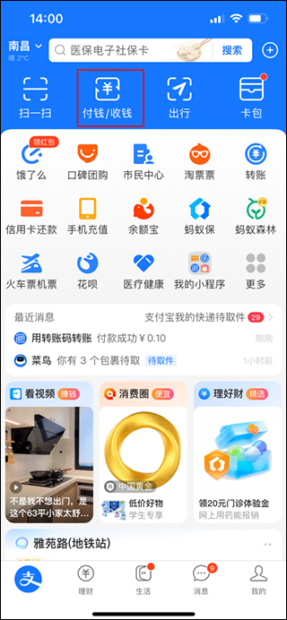 1、打开支付宝app,进入到app首页,点击页面上方的“付钱/收钱”选项;