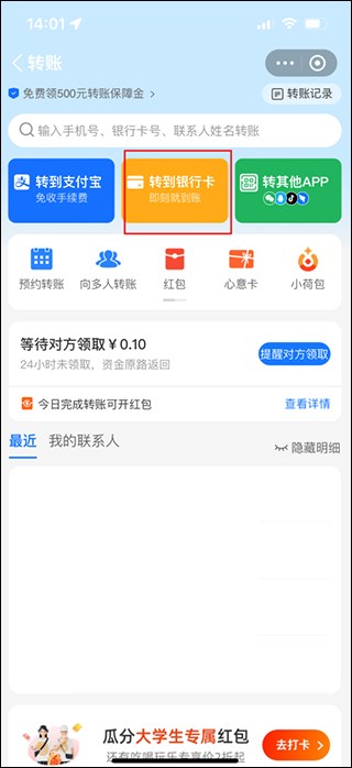 3、进入大转账页面,再点击页面上方的“转到银行卡”选项;
