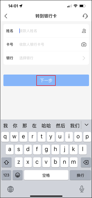 4、来到转到银行卡页面,输入对方的姓名跟卡号信息,再点击“下一步”按钮;